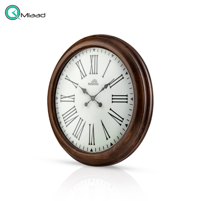 ساعت دیواری وودسان، ساعت دیواری ساخته شده با چوب طبیعی، سبک کلاسیک، مدل فیلادلفیا، اعداد یونانی و صفحه سفید و جزییات طلایی، سایز 80
