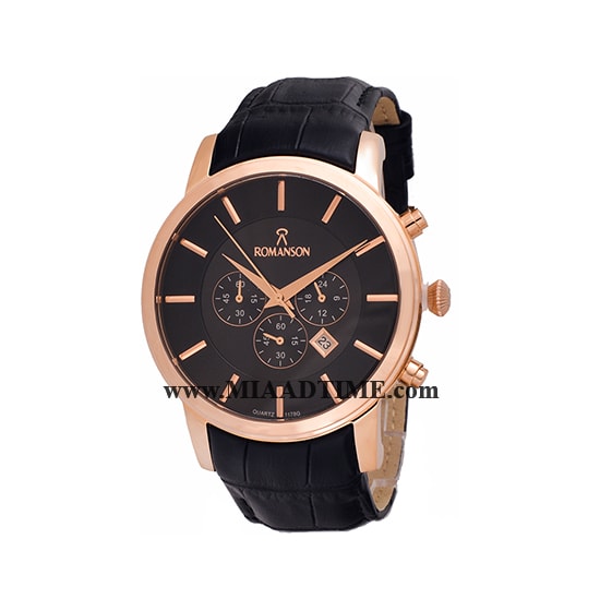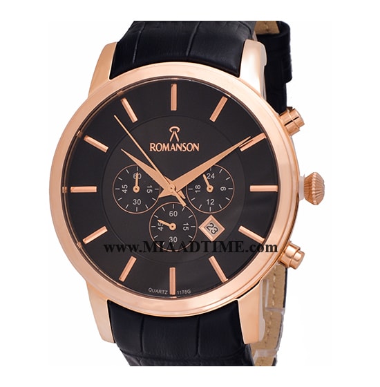 ساعت مچی رومانسون مردانه کرنوگراف گرد چرمی رزگلد صفحه مشکی کد 16298