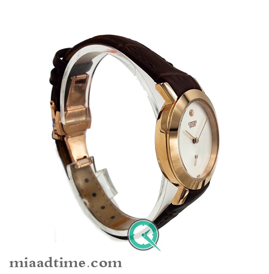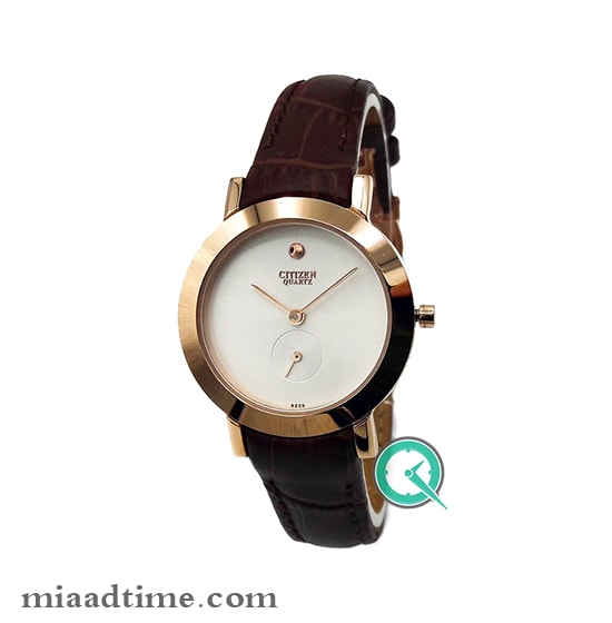 ساعت مچی سیتیزن زنانه زیرثانیه، گرد بند چرم، رزگلد صفحه سفید | کد 6225L