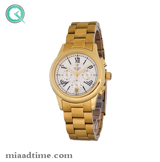 ساعت مچی ویولت زنانه کرنوگراف،گرد فلزی،طلایی،صفحه سفید،مدل 0401/2L