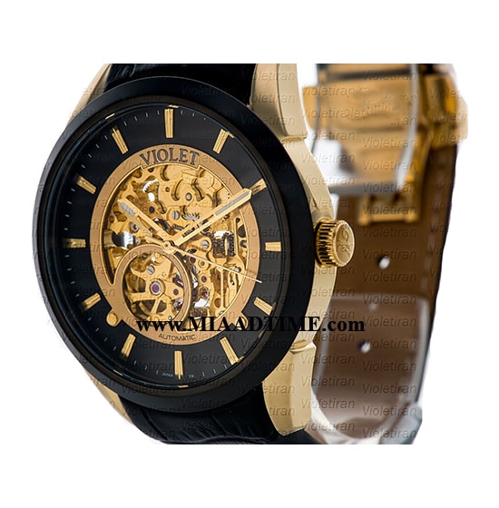 ساعت ویولت Violet مردانه اتوماتیک گرد چرمی طلایی مشکی صفحه مشکی کد 0432/2G