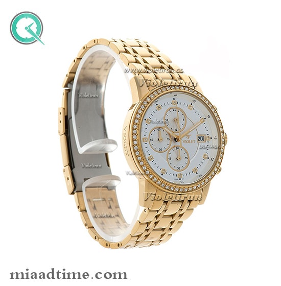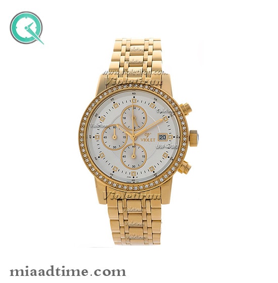 ساعت ویولت Violet زنانه کرنوگراف گرد دور نگین فلزی طلایی صفحه سفید کد 0376/2L
