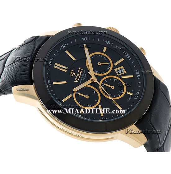 ساعت ویولت Violet مردانه کرنوگراف،گرد چرمی طلایی مشکی صفحه مشکی کد 0408/2G
