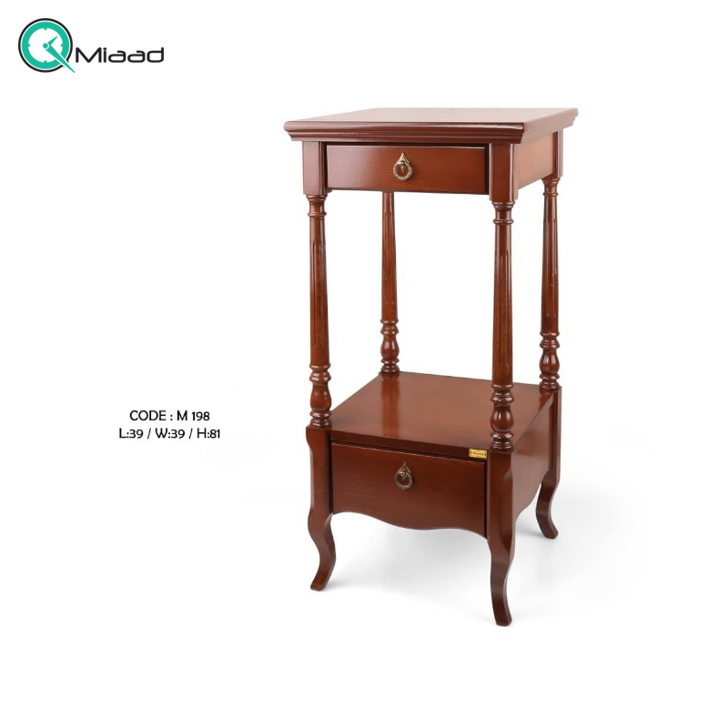 میز تلفن دو کشو چوبی مدل 198 یک میز تزیینی و دکوراتیو میباشد که میتواند فضایی برای نگه داری لوازم دکوری در اختیار شما قرار دهد. یکی از وسایل سنتی و تزیینی که از دیرباز در منازل و ادارات رایج بوده است میز تلفن است که می توانید تلفن، گرامافون، ضبط، رادیو تزیینی و وسایل مشابه خود را روی آن قرار دهید. در واقع پایه یا میز تلفن نه تنها وسیله ای برای قرار دادن گوشی در یک مکان خاص است، بلکه یک وسیله تزیینی زیبایی است که در آپارتمان های شیک یافت می شود. میزهای تلفن معمولا دارای ابعاد کوچک و جمع و جور هستند که در یک گوشه میتواند قرار بگیرد و البته مکان استفاده از میزهای تلفن کاملا سلیقه ای است.