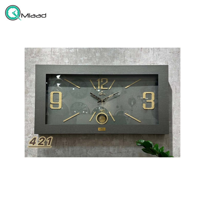 ساعت دیواری آرتا Arta کد 421، ساعت دیواری چهارگوش چوبی با متریال MDF، دارای پاندول و اعداد لاتین، دارای موتور آرامگرد، رنگ طوسی