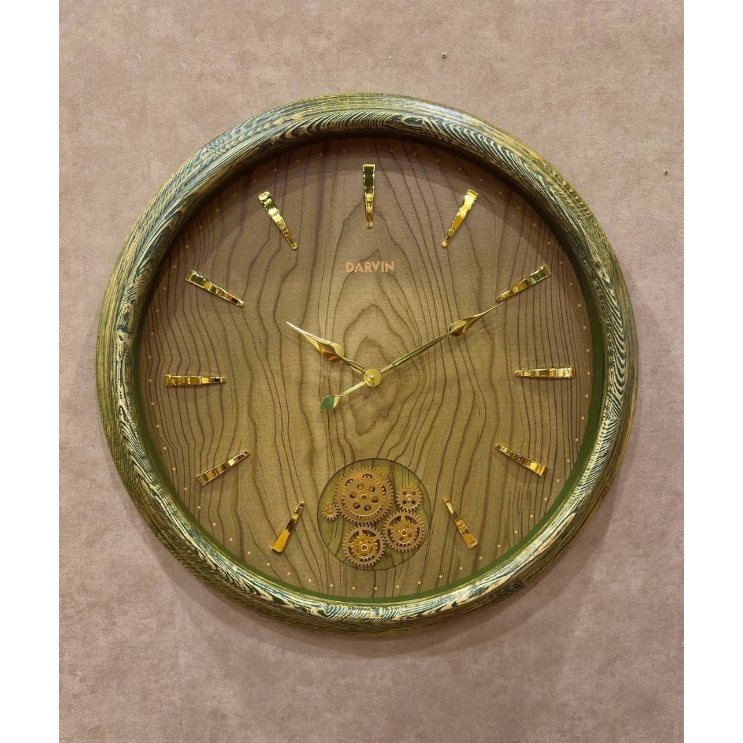 قاب زیبای این مدل که از چوب طبیعی ساخته شده، دو دایره را در خود جای داده است: دایره بالایی، یک ساعت کلاسیک و خوانا با صفحه چوبی است. اما جادوی اصلی در دایره پایینی نهفته است؛ جایی که چرخدندههای متحرک با حرکتی نرم و پیوسته، یک روح مکانیکی و هنری به ساعت بخشیدهاند. این حرکت دائمی، به ساعت حس زندگی و پویایی میدهد و تماشای آن بسیار لذتبخش است.