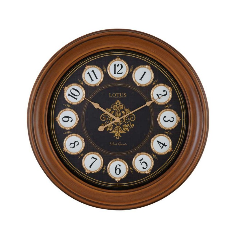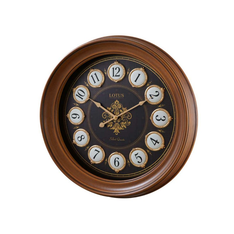 ساعت دیواری چوبی لوتوس مدل 013 از جدیدترین ساعت های چوبی لوتوس از کالکشن 2022 است که طراحی بی نظیری دارد. چیزی که خیلی در این مدل خودنمایی می کند ایندکس های متفاوت آن است. اعداد برجسته فلزی سفید تاج دار با حاشیه طلایی در بک گراند مشکی ساعت جلوه زیبایی دارند و در قسمت داخلی صفحه هم پترن تاج شکل طلایی اجرا شده کاملا با طرح اعداد هارمونی دارد. عقربه های کشیده و باریک طلایی هم در بک گراند تیره صفحه خیلی زیبا شده است. در مجموع این مدل یک ساعت اصیل و خاص است که طرحش می تواند سال ها ماندگار باشد و زییایی دیوار منزل شما را تضمین کند. لازم به ذکر است که لوتوس در این مدل از موتور آرامگرد یانگ تان تایوانی با ۵ سال گارانتی بی قید و شرط استفاده کرده است.