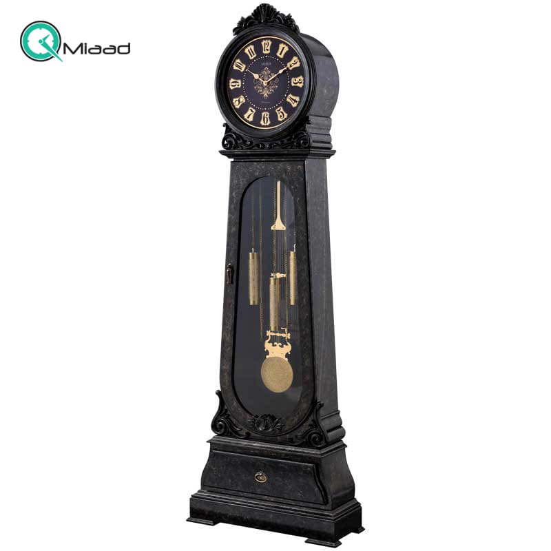 بدنه از جنس MDF روکش چوب راش، طراحی زیبا و منحصربفرد، موتور تایوانی، دارای موتور زنگ و پاندول، رنگ مشکی رگه های طلایی خاص به سبک سنگ ماربل پتینه شده، رنگ مشکیماربل