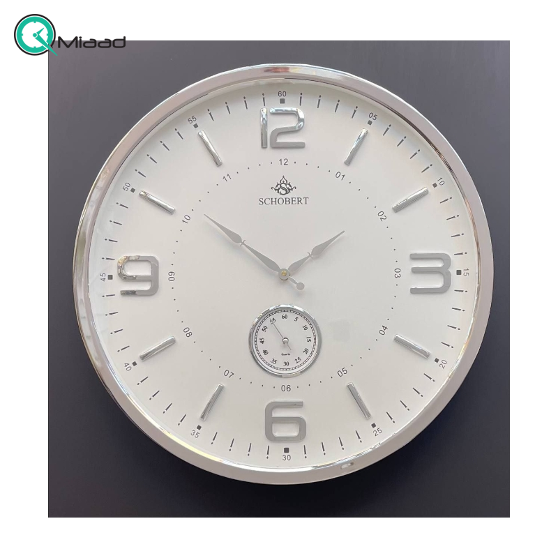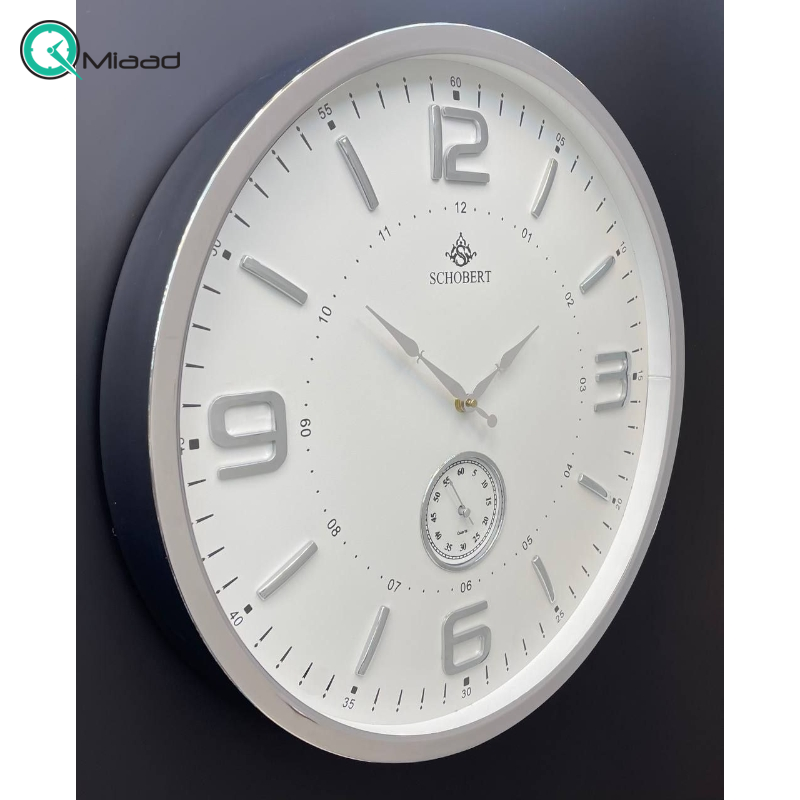 ساعت دیواری فلزی شوبرت مدل 5308QA، ساعت دیواری مدرن و فلزی جدید شوبرت، دارای موتور ثانیه شمار مستقل و اعداد لاتین، سایز 50، موتور آرامگرد، رنگ نقره ای صفحه سفید