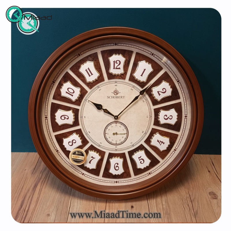 ساعت دیواری چوبی شوبرت مدل 6440، ساعت دیواری نوبل برند شوبرت، قطر 60 سانتیمتر، اعداد برجسته، با موتور ثانیه شمار و موتور آرامگرد تایوانی