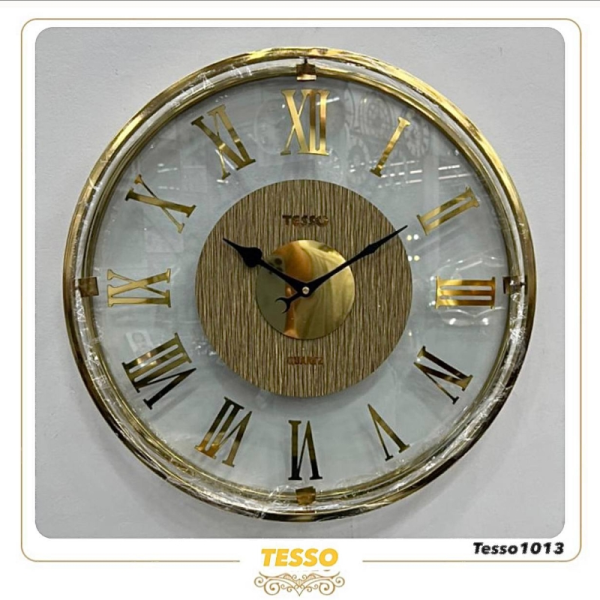 ساعت دیواری تسو مدل 1013، ساعت دیواری مدرن و ساده قطر 70 سانت با موتور آرامگرد، متریال فلز و چوب بدنه، رنگ طلایی
