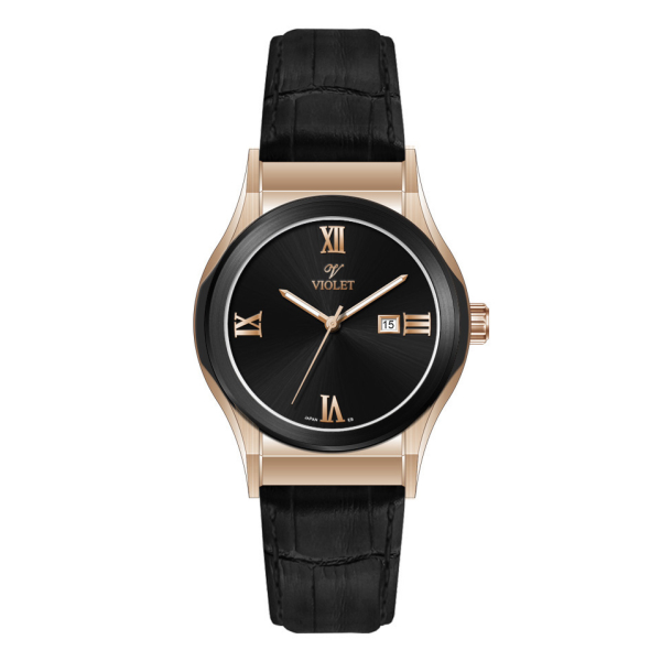 ساعت ویولت زنانه Violet کد 0565/2| ساعت زنانه اورجینال ساخت ژاپن، ساعت زنانه بند چرمی با شیشه یاقوت رزگلد صفحه مشکی تاپ رینگ مشکی