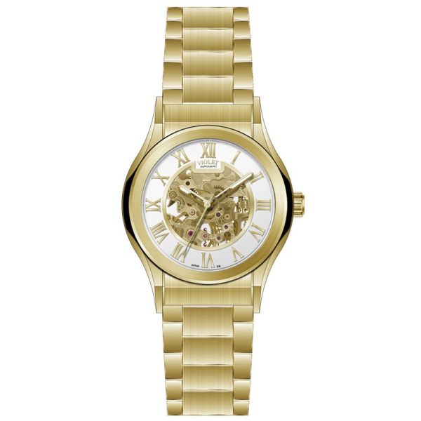 ساعت ویولت زنانهViolet | ساعت زنانه اورجینال ساخت ژاپن، ساعت زنانه اتوماتیک بند فلزی، کد 0562، رنگ طلایی صفحه سفید