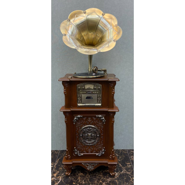 گرامافون ایستاده آنتیک فول مدل 2516 دارای بدنه ای از جنس چوب باکیفیت می باشد. این محصول در دسته محبوبترین گرامافون های وبسایت میعاد تایم می باشد که در ادامه بیشتر این محصول را بررسی می کنیم. گرامافون فقط محصولی نیست که در زمان های گذشته محبوبیت داشته و مورد استفاده قرار میگرفت. شما باید به این مورد آگاه باشید که گرامافون ها هنوز هم محبوبیت دارند. این وسیله هنوز هم مخاطبین خود را دارد و به عنوان یک کالای زینتی محسوب میشود که میتواند هر دکوری را زیباتر کند. البته این دستگاه یعنی گرامافون های امروزی با امکانات بسیار مدرن تر، میتواند جایگزین سیستم پخش بسیار حرفه ای باشد؛ ولی طرح و نقش کلاسیک و نوستالژی خود را حفظ کرده و همین دلیل بر محبوبیت این سری محصولات است. محصول امروز هم تمام ویژگی های یک محصول لوکس و کلاسیک را دارا می باشد و همچنین امکانات یک سیستم پخش حرفه ای هم در گرامافون مبله آنتیک اضافه شده است.