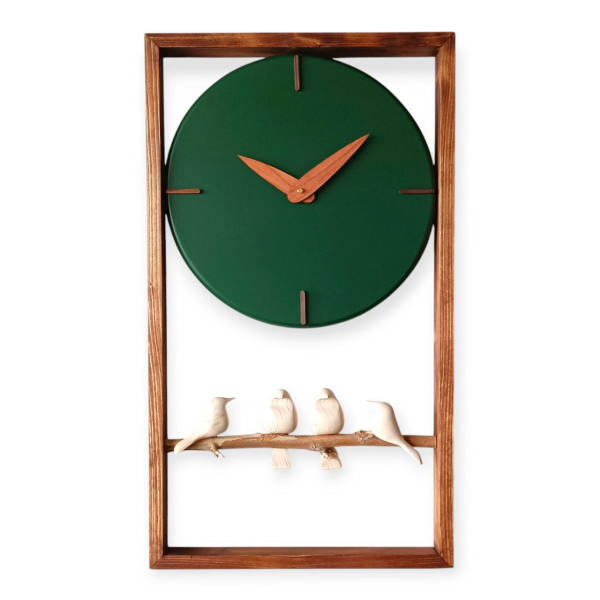 ساعت دیواری چوبی دست ساز مدل 170 کاملا دست ساز و تمام اجزای آن حتی پرنده ها، ساخته شده از چوب طبیعی باکیفیت است. موتور تایوانی که برای این مدل ساعت استفاده شده، آرام گرد و بدون صداست و هیچ گونه صدای تیک تاکی ندارد و براحتی در اتاق خواب نیز میتوانید آن را نصب کنید. ترکیب رنگی صفحه با اعداد و عقربه باعث شده تا ساعت از فاصله دور هم خوانایی بالایی داشته باشد و زیبایی ساعت را نیز دوچندان کند.