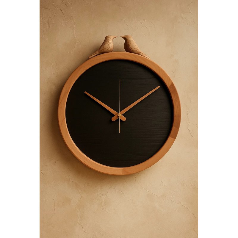 این ساعت فقط زمان را نشان نمیدهد؛ داستانی از عشق و طبیعت را روایت میکند. در بالای این ساعت، دو پرنده کوچک چوبی نشستهاند که نمادی از خانه، آرامش و با هم بودن هستند. این جزئیات هنرمندانه، ساعت شما را به یک قطعه دکوراتیو خاص تبدیل میکند. این محصول به صورت کاملاً دستساز و با عشق و دقت از چوب طبیعی ساخته شده است. طراحی مینیمال و بدون عدد صفحه، تمرکز را تماماً بر روی زیبایی طبیعی چوب و حرکت آرام عقربهها میگذارد. قاب و عقربههای چوبی روشن در تضادی زیبا با صفحه تیره ساعت قرار گرفتهاند که هم به خوانایی کمک میکند و هم جلوهای مدرن و شیک به آن میبخشد. این ساعت یک انتخاب بینظیر برای کسانی است که به دنبال اضافه کردن یک عنصر هنری، گرم و طبیعی به دکوراسیون خود هستند.