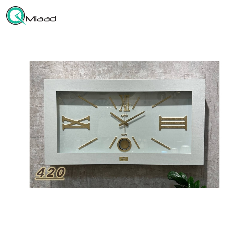 ساعت دیواری آرتا Arta کد 420، ساعت دیواری چهارگوش چوبی، دارای پاندول و اعداد لاتین، دارای موتور آرامگرد، رنگ سفید