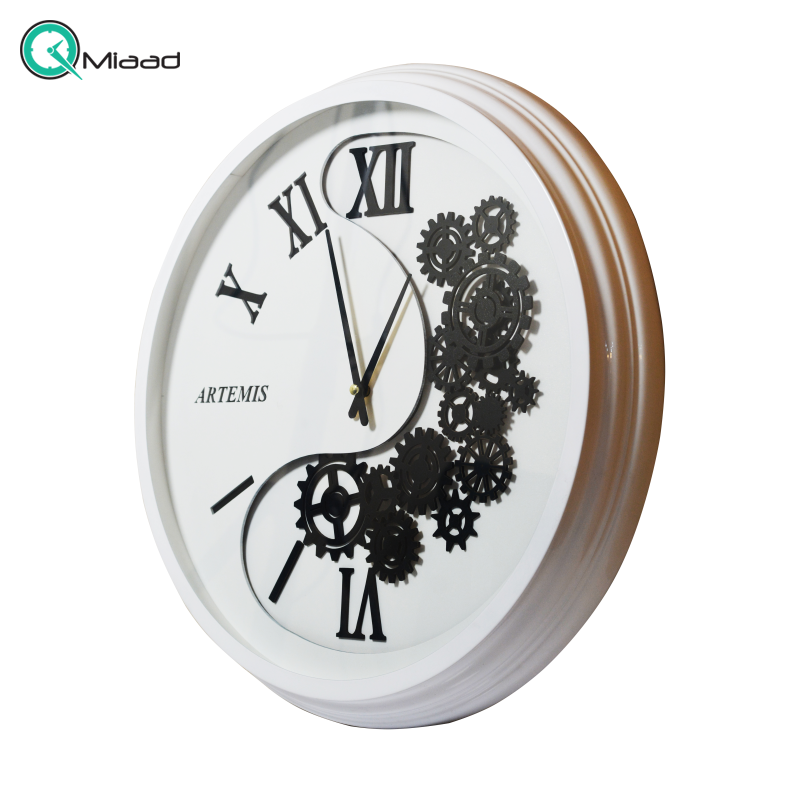 ساعت دیواری آرتمیس Artemis | گرد فلزی سایز 50 طرح چرخ دنده عدد برجسته | کد 2029 سفید