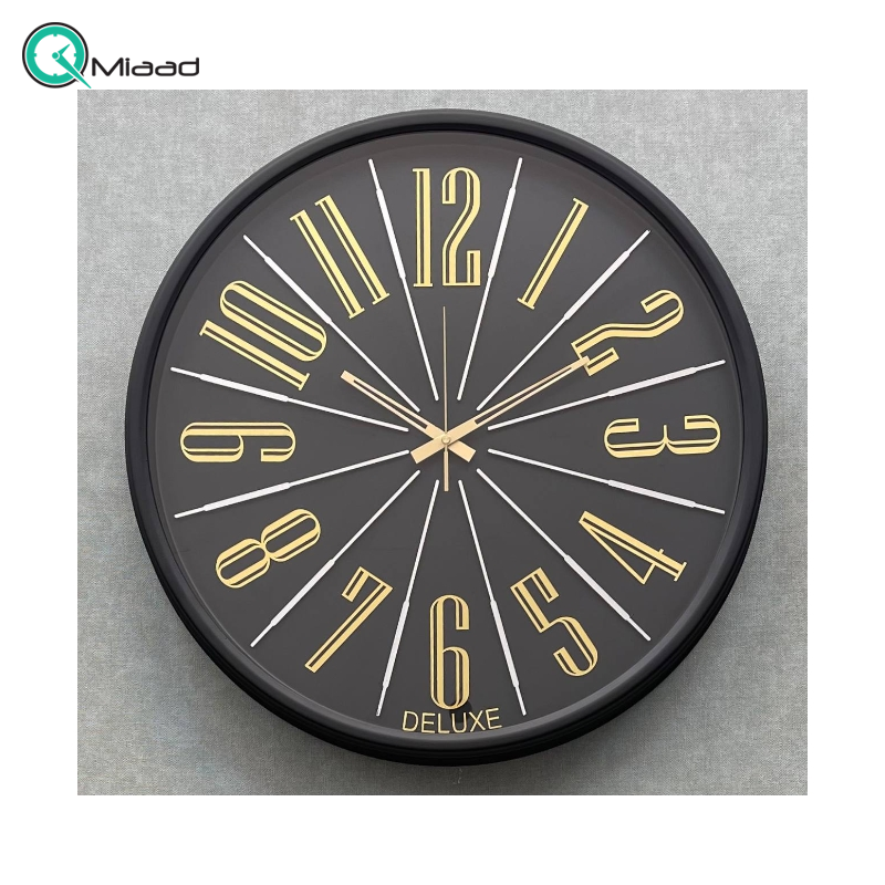 ساعتی بسیار زیبا و مینیمال با ترکیب رنگ مشکی طلایی از برند دلوکس که می تواند هر دیوار خالی را زیباتر کند. صفحه مشکی با جزییات روی صفحه ساعت و بدون هر جزییات اضافی به چشم نواز شدن این محصول کمک کرده است. این ساعت و تمام جزییات خیلی ظریف طراحی و تولید شده است. فونت لاتین اعداد روی صفحه ساعت بسیار چشمگیر و نوین می باشد و این ساعت مدرن را زیباتر کرده است. همچنین خطوط روی صفحه ساعت هم که اعداد را از هم جدا کرده است یه نظم خاصی را در صفحه ساعت ایجاد کرده است.