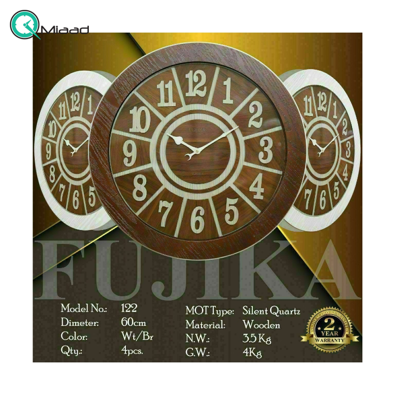 ساعت دیواری فوجیکا Fujika مدل 122 یکی از سری ساعت های فروشگاه میعاد تایم می باشد که برای شما در بخش ساعت دیواری موجود کرده است. فوجیکا برند جدیدی است که ساعت دیواری های زیبایی را خلق می کند و امروز هم یکی از سری ساعت دیواری های این برند را برای شما موجود کرده و در ادامه توضیحات لازمه را ارائه می دهیم.