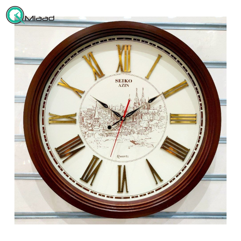 ساعت دیواری سیکو آذین مدل 220 رنگ قهوه ای صفحه کرم طلایی از سری ساعت دیواری های جدید میعاد تایم می باشد.