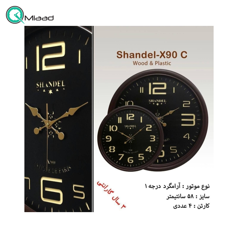 ساعت دیواری دو موتوره شاندل مدل X90-C قهوه ای تیره با قاب و فریم چوبی از استحکام نسبتا بالایی برخوردار می باشد. از آنجایی که در طراحی این ساعت دیواری جدید از صفحه چوبی با اعداد برجسته لاتین خوانا استفاده شده است می توان این ساعت را جزو ساعت های دیواری کلاسیک به حساب آورد. طراحی موتور ثانیه شمار آرام گرد در صفحه این ساعت دیواری، زیبایی آن را دوچندان کرده است. این ساعت با داشتن 2 موتور آرام گرد تایوانی مناسب افرادی است که به صدای تیک تاک ساعت حساس هستند و کیفیت بالای آنها خیال شما را بابت انتخاب یک ساعت دیواری چوبی با قیمت مناسب راحت می کند. در ادامه با ویژگی های این ساعت دیواری بیشتر آشنا می شویم: