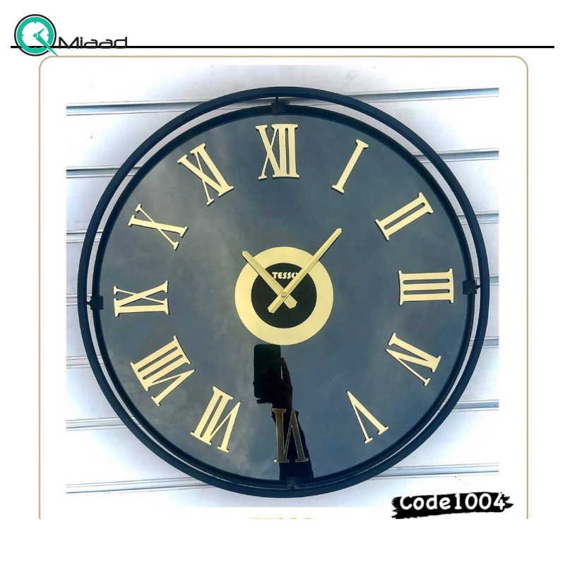 ساعت دیواری تسو مدل 1004، ساعت دیواری مدرن و ساده فلزی قطر 60 سانت با موتور آرامگرد، رنگ مشکی طلایی با آبکاری فورتیک، دارای اعداد رومی برجسته